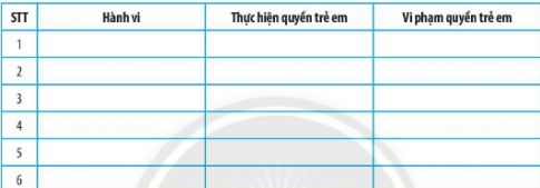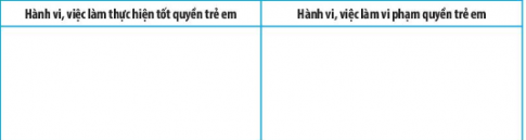Bài tập 3 trang 52 SBT Giáo dục công dân 6: Nêu những hành vi, việc làm thực hiện quyền trẻ em và vi phạm quyền trẻ em trong gia đình, nhà trường, xã hội theo bảng gợi ý dưới đây.