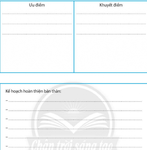 Bài tập 7 trang 28 SBT Giáo dục công dân 6: Em hãy trò chuyện với 3 người (bố mẹ, bạn bè, thầy cô và những người xung quanh) mà em tin tưởng để biết được những nhận xét của họ về những ưu – nhược điểm của em, nhờ họ góp ý những điểm mà em cần khắc phục để có thể phát triển bản thân. Hãy lựa chọn những góp ý phù hợp để xây dựng kế hoạch hoàn thiện bản thân em trong năm học này.