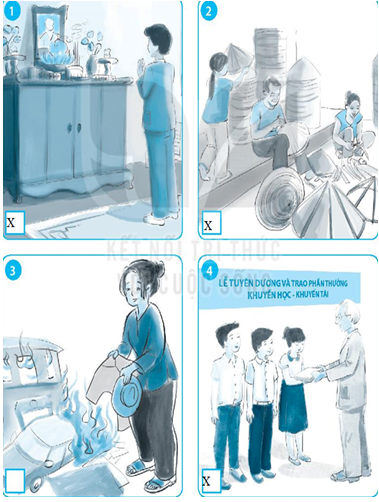 Bài 1 trang 5 sách bài tập GDCD 6: Em hãy đánh dấu X vào ô trống ở bức tranh thể hiện truyền thống tốt đẹp của gia đình, dòng họ Việt Nam.