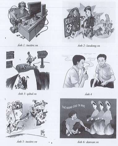 Bài 1 trang 53 SBT GDCD 7: Em hãy quan sát và cho biết mỗi hình ảnh dưới đây nói về tệ nạn xã hội nào.