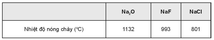 - Do điện tích cation hình thành hợp chất MgF2 cao hơn điện tích cation hình thành hợp chất NaF, trong khi bán kính cation Mg2+ lại nhỏ hơn bán kính cation Na+ nên NaF phải có nhiệt độ nóng chảy thấp hơn MgF2.