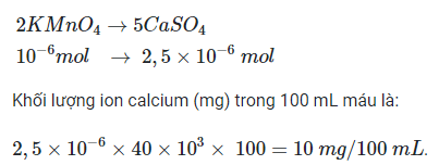 OT4.10 trang 50 SBT Hóa học 10. Ion Ca2+ cần thiết cho máu của người hoạt động bình thường. Nồng độ ion calcium không bình thường là dấu hiệu của bệnh. Để xác định nồng độ ion calcium, người ta lấy mẫu máu, sau đó kết tủa ion calcium dưới dạng calcium oxalate (CaC2O4) rồi cho calcium oxalate tác dụng với dung dịch potassium permanganate trong môi trường acid theo phản ứng sau: