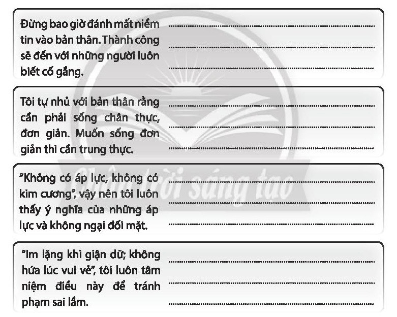 Bài tập 2 trang 14 SBT Hoạt động trải nghiệm 10: Chia sẻ suy nghĩ của em về quan điểm sống của các bạn dưới đây: