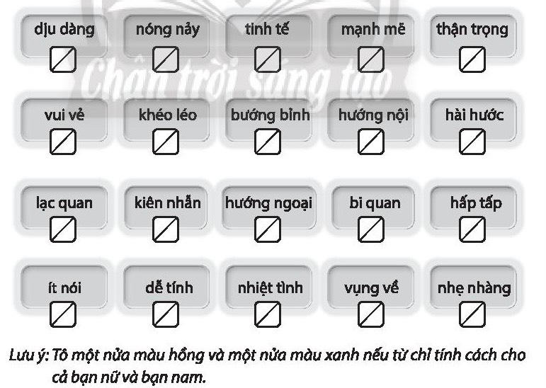 Bài tập 2 trang 15 SBT Hoạt động trải nghiệm 10: Tô màu hồng vào ô ở từ chỉ tính cách em lựa chọn cho bạn nữ và màu xanh vào ô ở từ chỉ tính cách em lựa chọn cho bạn nam dưới đây: