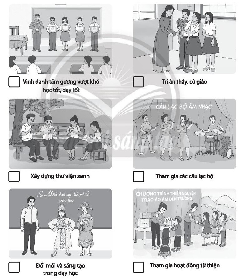 Bài tập 1 trang 21 SBT Hoạt động trải nghiệm 10: Quan sát và đánh dấu X vào ô trống dưới các hoạt động trở thành truyền thống trường em.