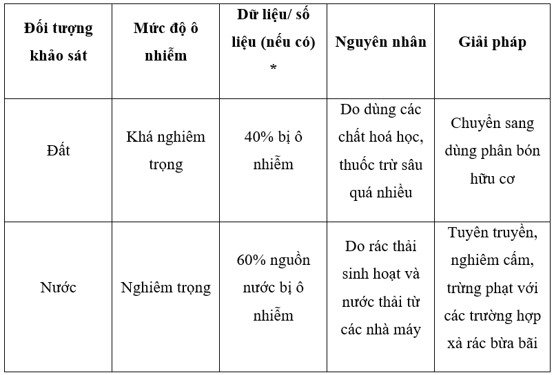 Bài tập 1 trang 79 SBT Hoạt động trải nghiệm 10: Tổng hợp thực trạng ô nhiễm, nêu nguyên nhân của thực trạng và đề xuất giải pháp khắc phục tình trạng ô nhiễm.