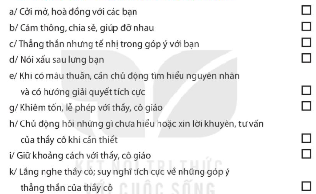 Câu 1 trang 6 SBT HĐTN 6: Đánh dấu X vào ô trống ở câu trả lời đúng về những việc nên làm để thiết lập quan hệ với thầy cô và bạn bè.