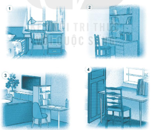 Câu 2 trang 20 SBT HĐTN 6: Hãy tham khảo cách sắp xếp góc học tập trong các hình dưới đây và tùy vào điều kiện thực tế của gia đình mình để đưa ra ý tưởng thiết kế góc học tập của mình. Nếu không thiết kế được trên bản vẽ, em hãy viết đoạn văn ngắn thuyết minh cách thiết kế góc học tập của em: