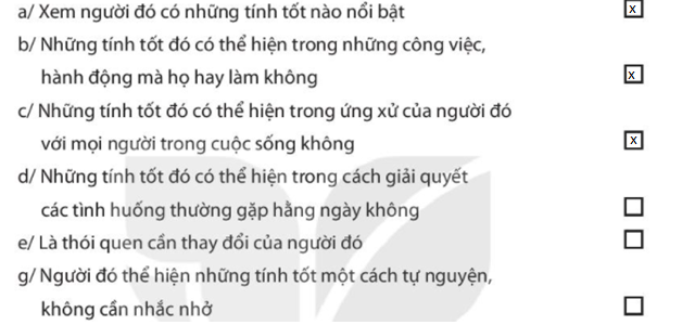 Câu 1 trang 12 SBT HĐTN 6: Những phương án nào dưới đây phù hợp với suy nghĩ của em khi xác định đức tính đặc trưng của mỗi người