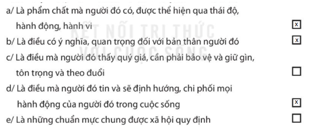 Câu 1 trang 14 SBT HĐTN 6: Những ý kiến nào dưới đây phù hợp với suy nghĩ của em về giá trị của cá nhân (Đánh dấu X vào ô trống ở những phương án em chọn)