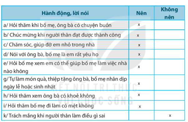 Câu 1 trang 27 SBT HĐTN 6: Nên hay không nên thể hiện những hành động, lời nói dưới đây để động viên, chăm sóc người thân trong gia đình (Đánh dấu X vào ô em chọn)