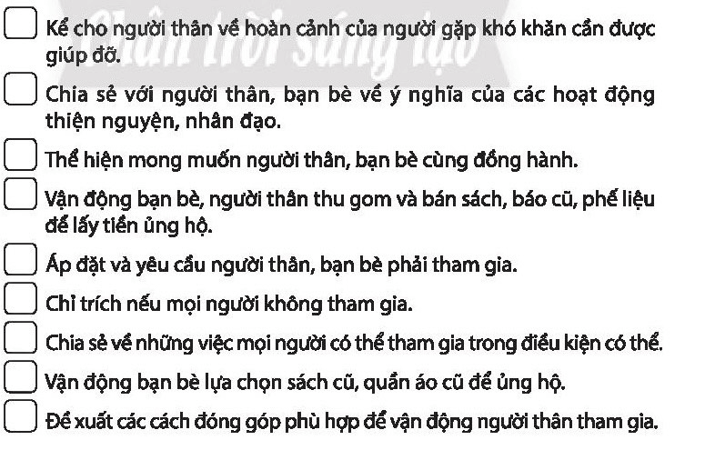 Bài tập 2 trang 44 sách bài tập HĐTN 7: Đánh dấu X vào ô trống trước những cách mà em đã sử dụng để vận động người thân, bạn bè cùng tham gia các hoạt động thiện nguyện, nhân đạo.