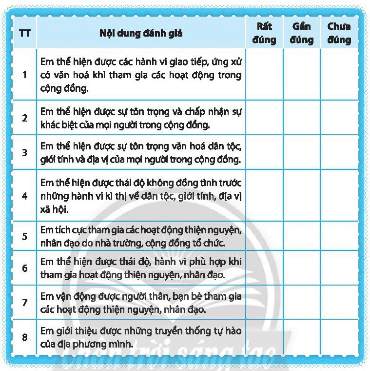 Em có thể hiện được các hành vi giao tiếp, ứng xử có văn hóa khi tham gia các hoạt động trong cộng đồng |