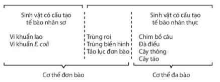 Bài 19.8 trang 66 sách bài tập KHTN 6: Cho các sinh vật sau: vi khuẩn lao, chim bồ câu, vi khuẩn E.coli, đà điểu, cây thông, trùng roi, cây táo, trùng biến hình, tảo lục đơn bào. Hãy sắp xếp các đại diện trên vào đúng vị trí trên sơ đồ dưới đây:
