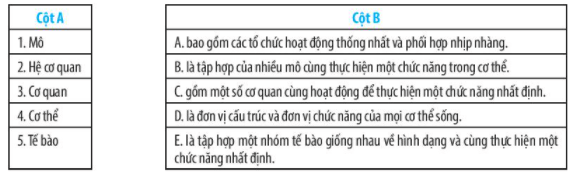 Bài 20.4 trang 69 sách bài tập KHTN 6: Nối các cấp độ tổ chức trong cơ thể đa bào ở cột A với các định nghĩa tương ứng ở cột B.