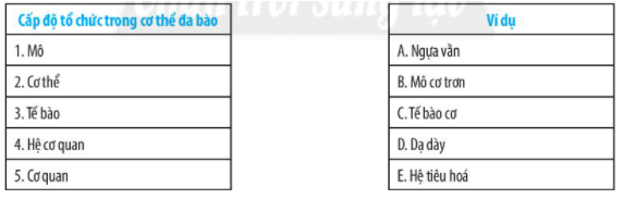 Bài 20.3 trang 69 sách bài tập KHTN 6: Nối các cấp độ tổ chức trong cơ thể đa bào ở cột bên trái với các ví dụ tương ứng ở cột bên phải.