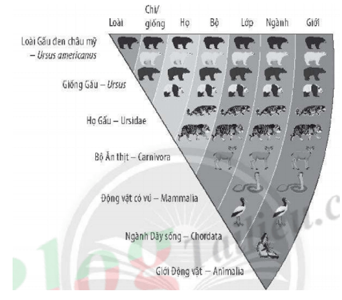Bài 22.7 trang 78 sách bài tập KHTN 6: Quan sát sơ đồ phân loại dưới đây, hãy xác định các bậc phân loại (Họ, Bộ, Lớp, Ngành, Giới) của loài Gấu trúc trong hàng thứ tư từ trên xuống.