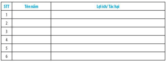Bài 28.8 trang 94 sách bài tập KHTN 6: Hãy nêu tên một số nấm và lợi ích, tác hại của các loại nấm đó trong tự nhiên và trong thực tiễn bằng cách hoàn thành bảng sau: