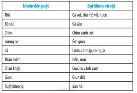 Bài 31.8 trang 102 sách bài tập KHTN 6: Cho các đại diện sinh vật: cá mập, cá voi, chim cánh cụt, ếch giun, cá sấu, thú mỏ vịt, cua, san hô, giun đất, hến, mực, bọ cánh cam, lươn, hươu, cá ngựa. Hãy sắp xếp chúng vào các nhóm động vật theo bảng sau: