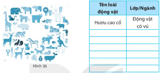 Bài 36.8 trang 61 sách bài tập KHTN 6: Quan sát hình 36 minh họa một số loài động vật. Em hãy hoàn thành bảng tên các loài động vật có trong hình mà em biết và cho biết loài đó thuộc ngành/lớp động vật nào.
