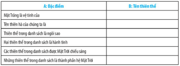 Bài 45.7 trang 129 sách bài tập KHTN 6: Chọn các tử: Mặt Trăng, Sao Thuỷ, Ngân Hà, Trái Đất, Mặt Trời để điền vào cột B trong bảng sau: