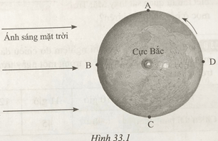 Bài 33.5 trang 81 sách bài tập KHTN 6: Hình 33.1 cho thấy hình ảnh Trái Đất khi chúng ta nhìn vào cực Bắc, chiều quay của Trái Đất và hướng ánh sáng từ Mặt Trời chiếu tới. Em hãy ghép các thông tin ở cột B tương ứng với các địa điểm trên Trái Đất được đưa ra ở cột A.