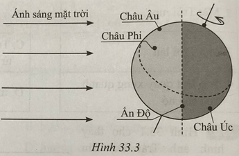 Từ đó, quan sát hình 33.3 ta thấy: Châu Úc sẽ là địa điểm thấy Mặt Trời mọc đầu tiên sau đó lần lượt là Ấn Độ, Châu Phi và Châu Âu.
