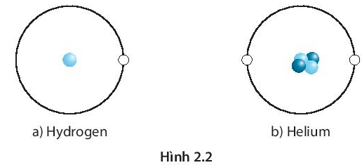 Mặt Trời chứa chủ yếu hai nguyên tố hóa học là hydrogen (H) và helium (He). Hình 2.2 biểu diễn một nguyên tử hydrogen và một nguyên tử helium.