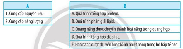Bài 22.8 trang 59 SBT Khoa học tự nhiên 7: Hãy nối vai trò của quá trình trao đổi chất và chuyển hóa năng lượng đối với cơ thể sinh vật ở cột A và ví dụ ở cột B sao cho phù hợp.