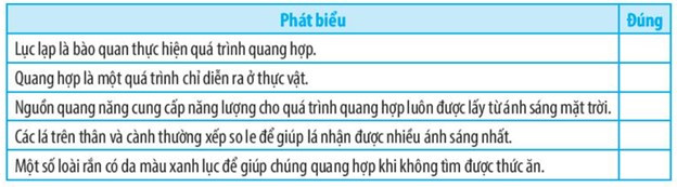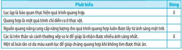 + “Quang hợp là một quá trình chỉ diễn ra ở thực vật” là phát biểu sai. Vì ngoài thực vật, một số loại vi khuẩn như vi khuẩn lam hoặc một số loài nguyên sinh vật như trùng roi cũng có khả năng quang hợp.