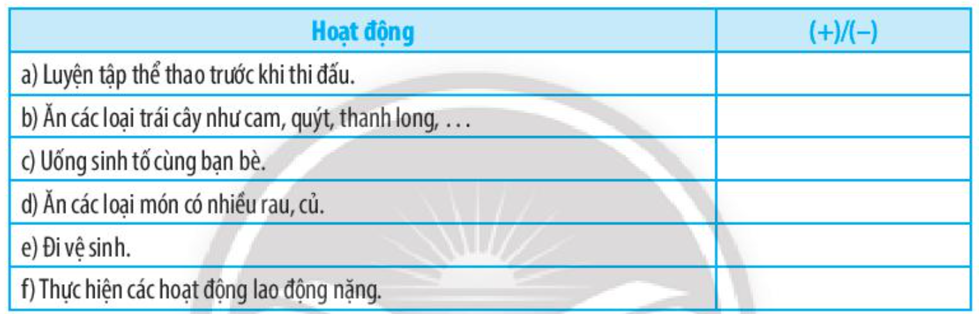 Bài 30.3 trang 74 SBT Khoa học tự nhiên 7: Em hãy xác định những hoạt động sau đây sẽ cung cấp nước (+) hay làm mất nước (-) của cơ thể.