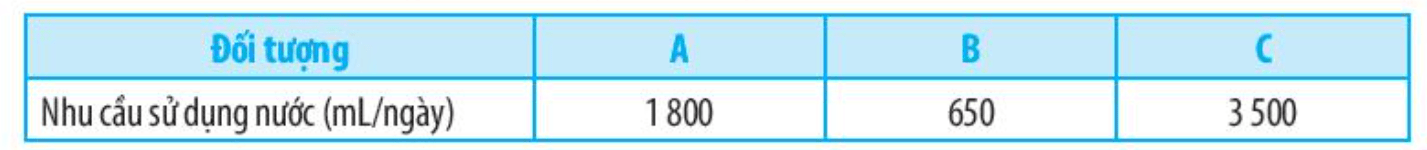 Bài 30.8 trang 75 SBT Khoa học tự nhiên 7: Có ba người A, B, C tham gia một nghiên cứu tìm hiểu về nhu cầu sử dụng nước của cơ thể. Kết quả thu được ở bảng sau.