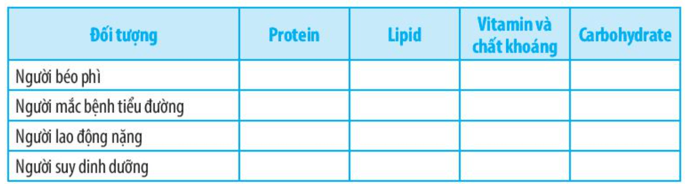 Bài 30.11 trang 76 SBT Khoa học tự nhiên 7: Em hãy cho biết những đối tượng trong bảng bên dưới cần cung cấp (+) hay cần hạn chế (-) ăn những loại thức ăn giàu các nhóm chất sau đây.