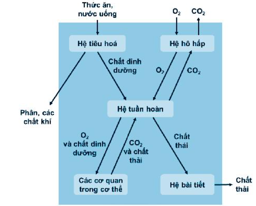 Sơ đồ thể hiện mối quan hệ giữa hệ tiêu hoá, hệ hô hấp, hệ tuần hoàn và hệ bài tiết trong quá trình trao đổi nước và các chất dinh dưỡng ở động vật: