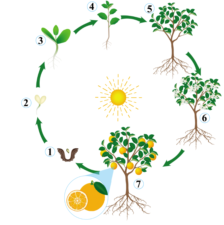 (1) hạt; (2) hạt nảy mầm; (3) cây mầm; (4) cây con; (5) cây trưởng thành;