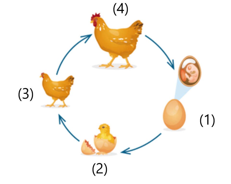 (1) trứng; (2) con non; (3) gà choai; (4) gà mái trưởng thành
