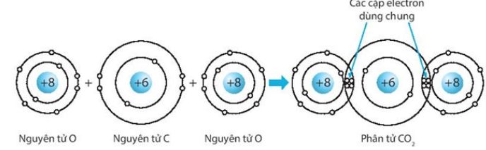 c) Biểu diễn sự hình thành liên kết cộng hóa trị trong phân tử carbon dioxide, CO2: