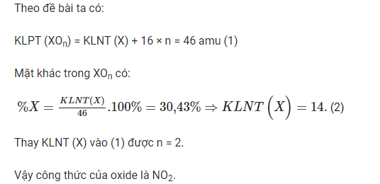 Bài 7.18 trang 25 SBT Khoa học tự nhiên 7: Một oxide có công thức XOn, trong đó X chiếm 30,43% (khối lượng); Biết khối lượng phân tử của oxide bằng 46 amu. Xác định công thức hóa học của oxide trên.