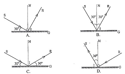 Bài 13.4 trang 30 SBT Khoa học tự nhiên 7: Một tia sáng chiếu tới gương phẳng với góc tới là 300. Hình vẽ nào sau đây biểu diễn đúng sự phản xạ của tia sáng trên gương?