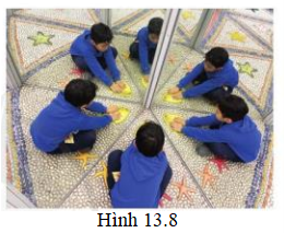 a) Khi đi tham quan nhà gương ở công viên, một bạn học sinh thấy một em bé ngồi trước hai gương phẳng ghép với nhau thì có rất nhiều ảnh trong gương (hình 13.8). Bạn học sinh đó thắc mắc, không biết số ảnh trong gương phụ thuộc vào yếu tố nào? Em hãy đưa ra câu trả lời dự đoán.