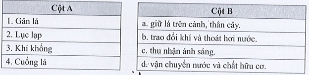Bài 18.1 trang 41 sách bài tập Khoa học tự nhiên 7: Ghép các bộ phận của lá (cột A) với chức năng tương ứng (cột B) cho phù hợp.