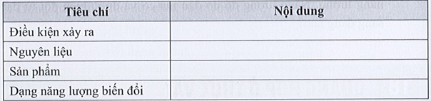 Bài 18.6 trang 42 sách bài tập Khoa học tự nhiên 7: Hoàn thành bảng sau về quá trình quang hợp.