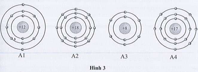 Bài 3.7 trang 11 SBT Khoa học tự nhiên 7: Quan sát mô hình cấu tạo của bốn nguyên tử thuộc bốn nguyên tố có kí hiệu lần lượt là A1, A2, A3, A4 dưới đây:
