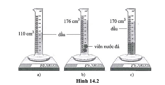 a) Từ hình 14.2a và 14.2b, ta có thể xác định được khối lượng riêng của nước đá.