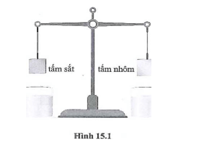 Bài 15.6 trang 33 Sách bài tập KHTN 8: Hai tấm sắt và nhôm có cùng khối lượng được treo vào hai đầu cân, khi đó, cân thăng bằng (hình 15.1). Điều gì xảy ra khi nhúng ngập hoàn toàn cả hai tấm sắt và nhôm vào trong nước? Biết khối lượng riêng của sắt và nhôm lần lượt là 7 800 kg/m3 và 2 700 kg/m3.