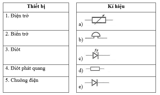 Bài 21.3 trang 43 Sách bài tập KHTN 8: Ghép tên của các thiết bị ở cột bên trái với kí hiệu tương ứng của chúng khi biểu diễn trong sơ đồ mạch điện ở cột bên phải.