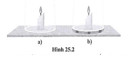 Nếu chụp một ống nhựa hình trụ tròn hở hai đầu sao cho đầu dưới sát mặt bàn (hình 25.2a) thì ngọn nến cháy một lúc rồi tắt, vì khi cháy, khí carbon đioxide bay lên và không xảy ra hiện tượng đối lưu để cung cấp khí oxygen cho sự cháy nên khí oxygen hết dần làm nến tắt.
