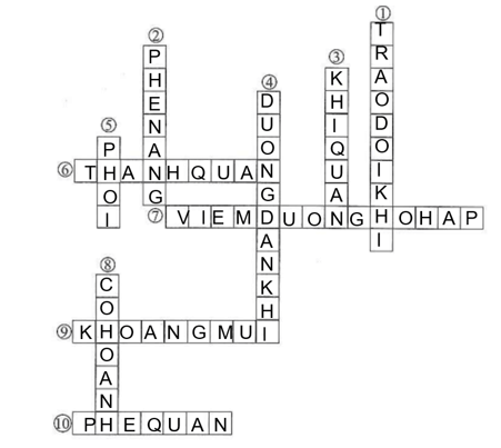 Bài 32.10 trang 65 Sách bài tập KHTN 8: Dựa vào gợi ý dưới đây, hãy tìm ô chữ hàng ngang và hàng dọc (chữ cái điền là tiếng Việt không dấu, ví dụ HOHAP)