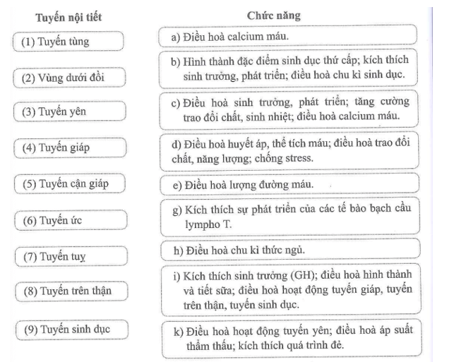 Bài 35.3 trang 70 Sách bài tập KHTN 8: Nối tuyến nội tiết với chức năng của nó cho phù hợp.
