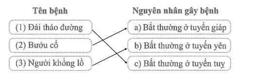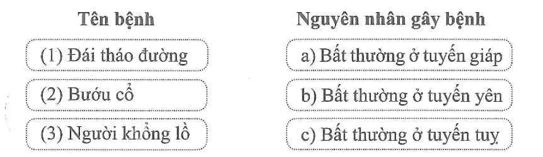 Bài 35.8 trang 71 Sách bài tập KHTN 8: Nối tên mỗi bệnh nội tiết với nguyên nhân gây ra bệnh đó cho phù hợp.